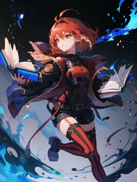 open jacket, black shirt, shorts, striped thighhighs,