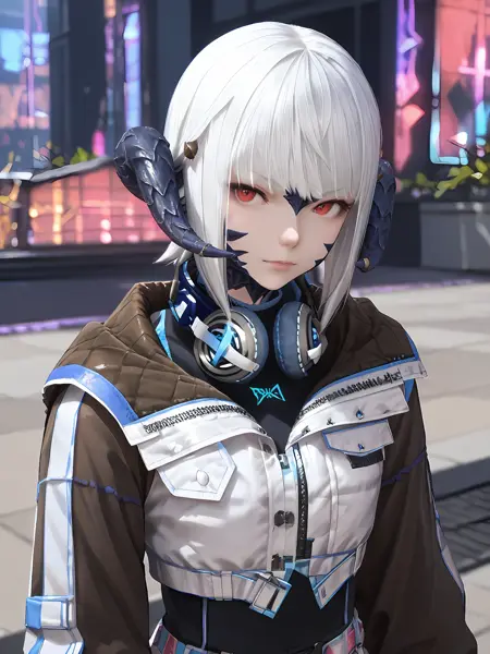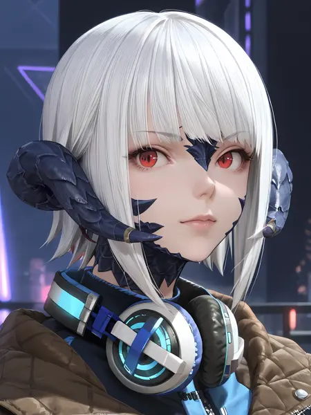 lora:aura4_Illustrious:1, aura4FF14, au ra, horns, dragon horns, scales, red eyes, white hair, short hair, bangs,
