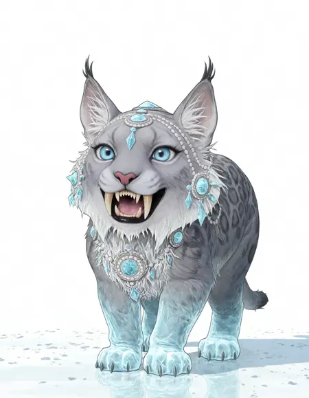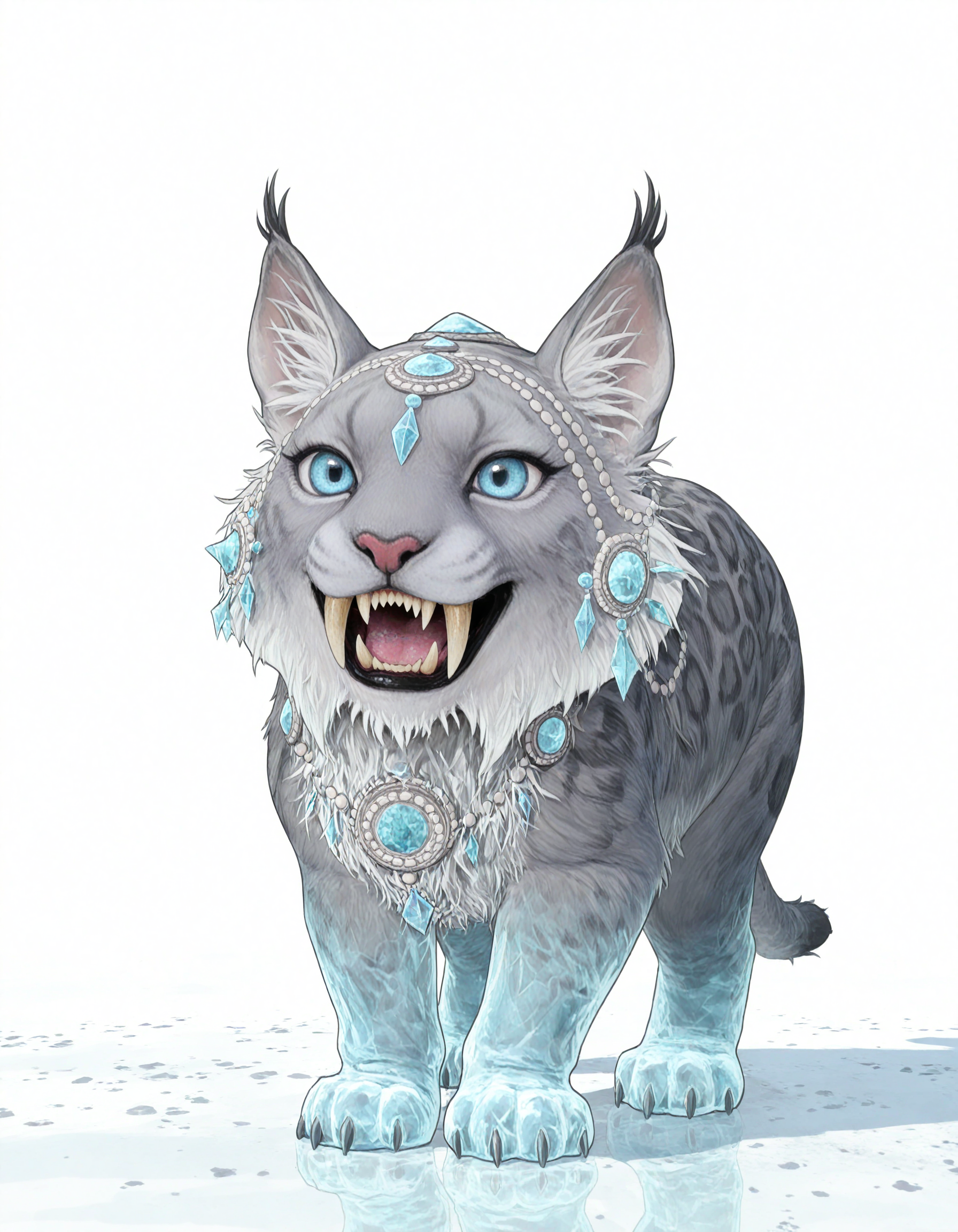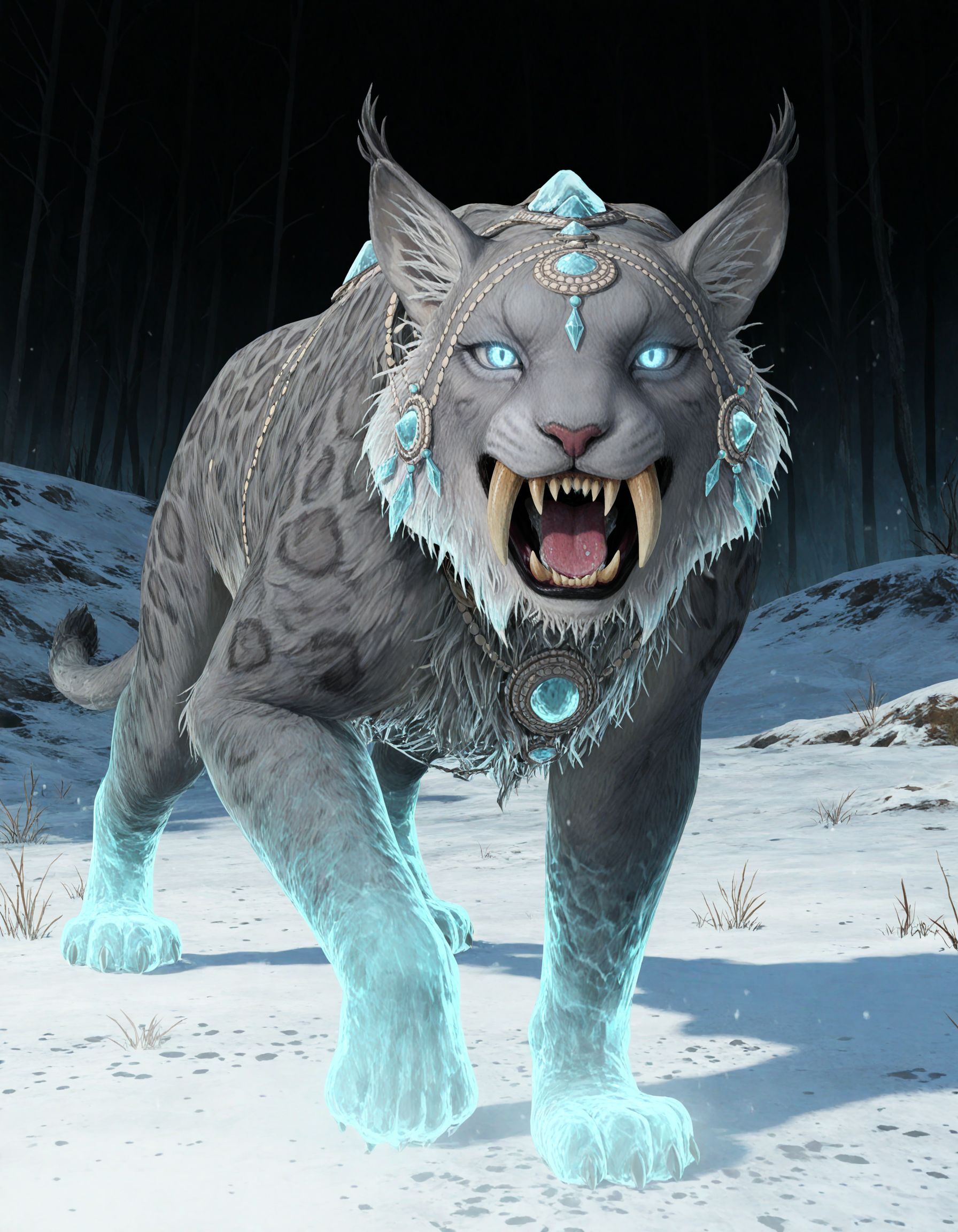 SnowLeopard, gem, jewelry, fangs, glowing, ice feet, ice tail,