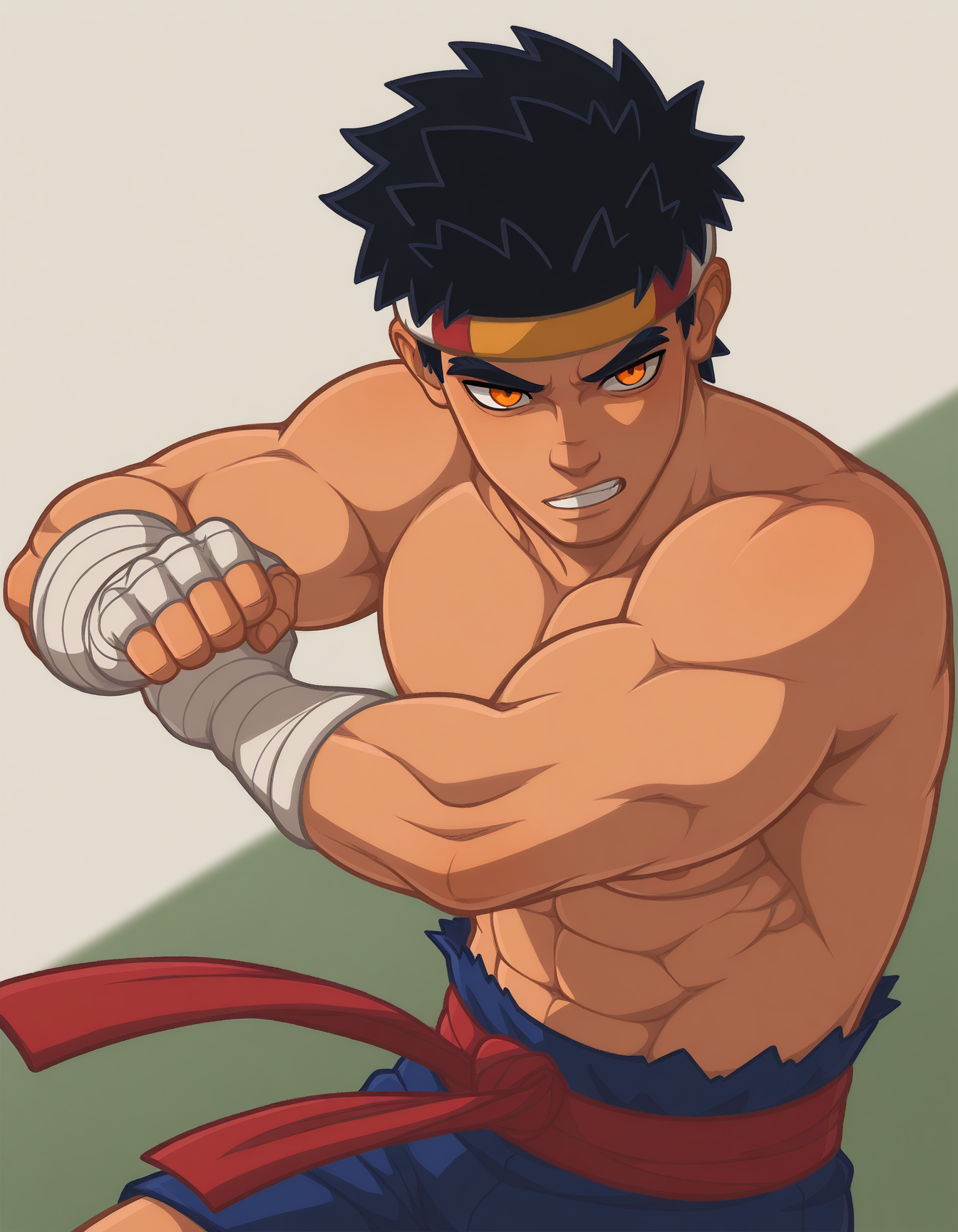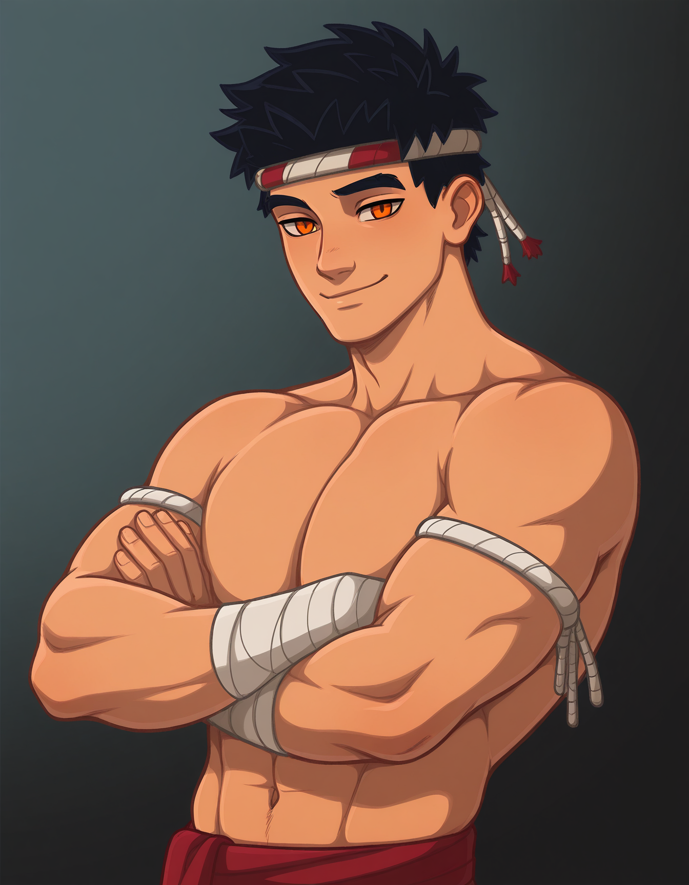 프롬프트: Tong-vkstickrs, 남성, 상반신 노출, 흰색 붕대, 근육질, 주황색 눈, 빨간 스카프, 파란색 반바지.
