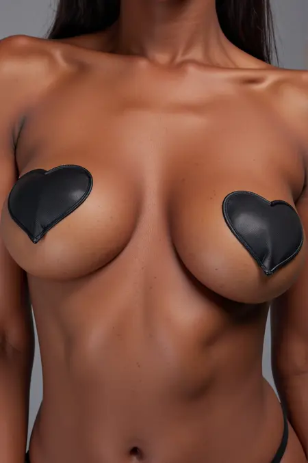 触发词: p4sties, pasties, nipple covers, adhesive tape, high-resolution photograph, heart-shaped, rhinestone, tassels, chain
