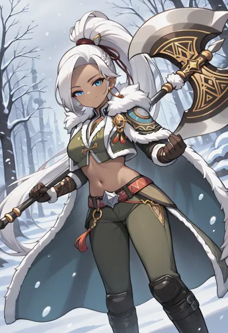 pants,knee boots,fur trim,cape,piercing,earrings,jewelry,navel,midriff,battle axe,axe,holding axe,black footwear,coat,black footwear,coat,