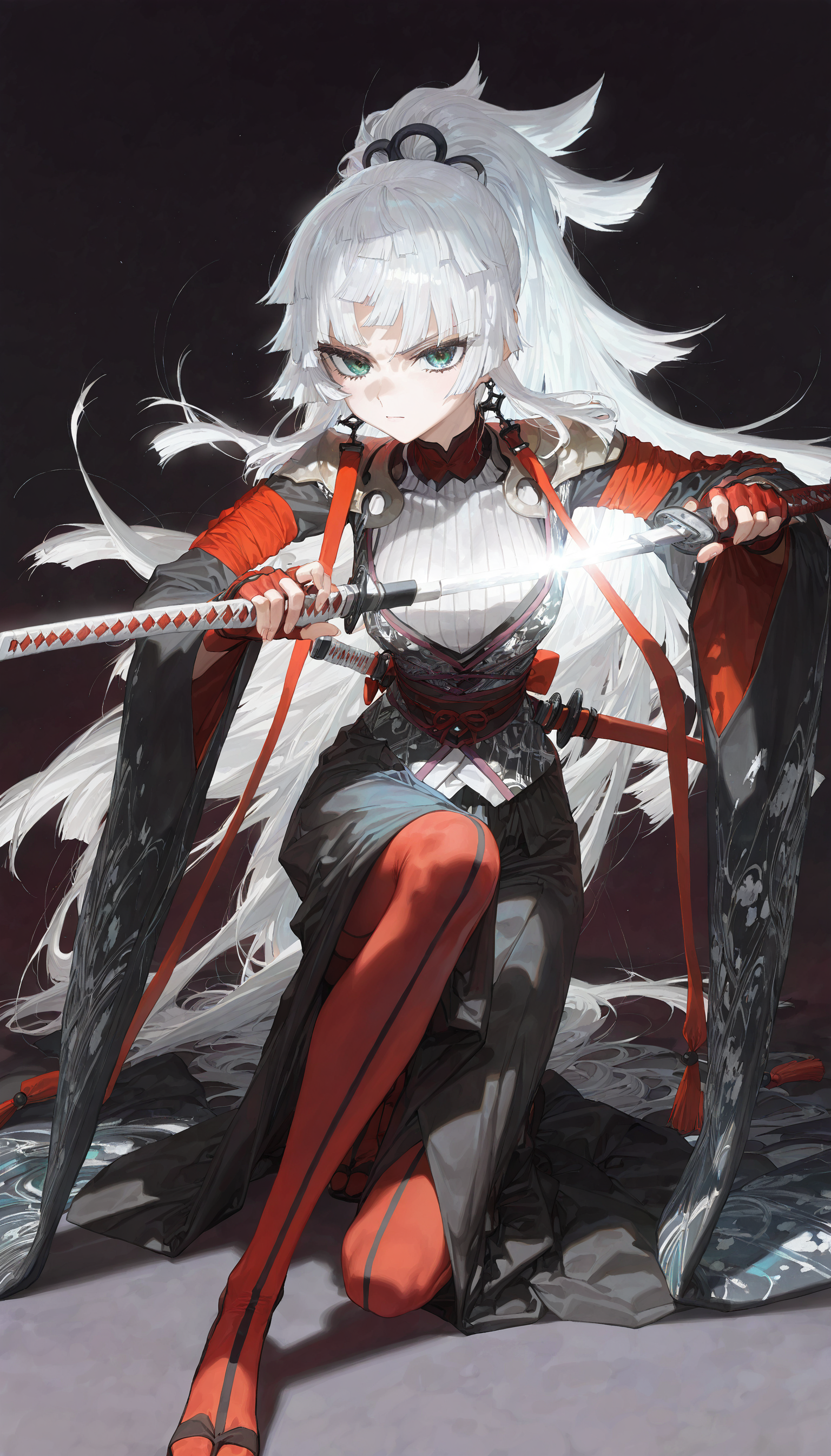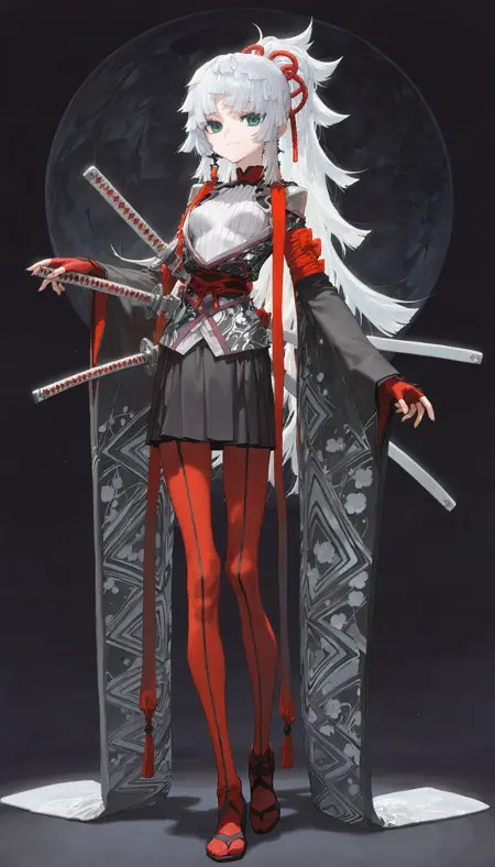黒い着物、指なし手袋、帯、サッシュ、赤いパンスト、黒いスカート、リブシャツ、