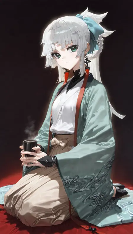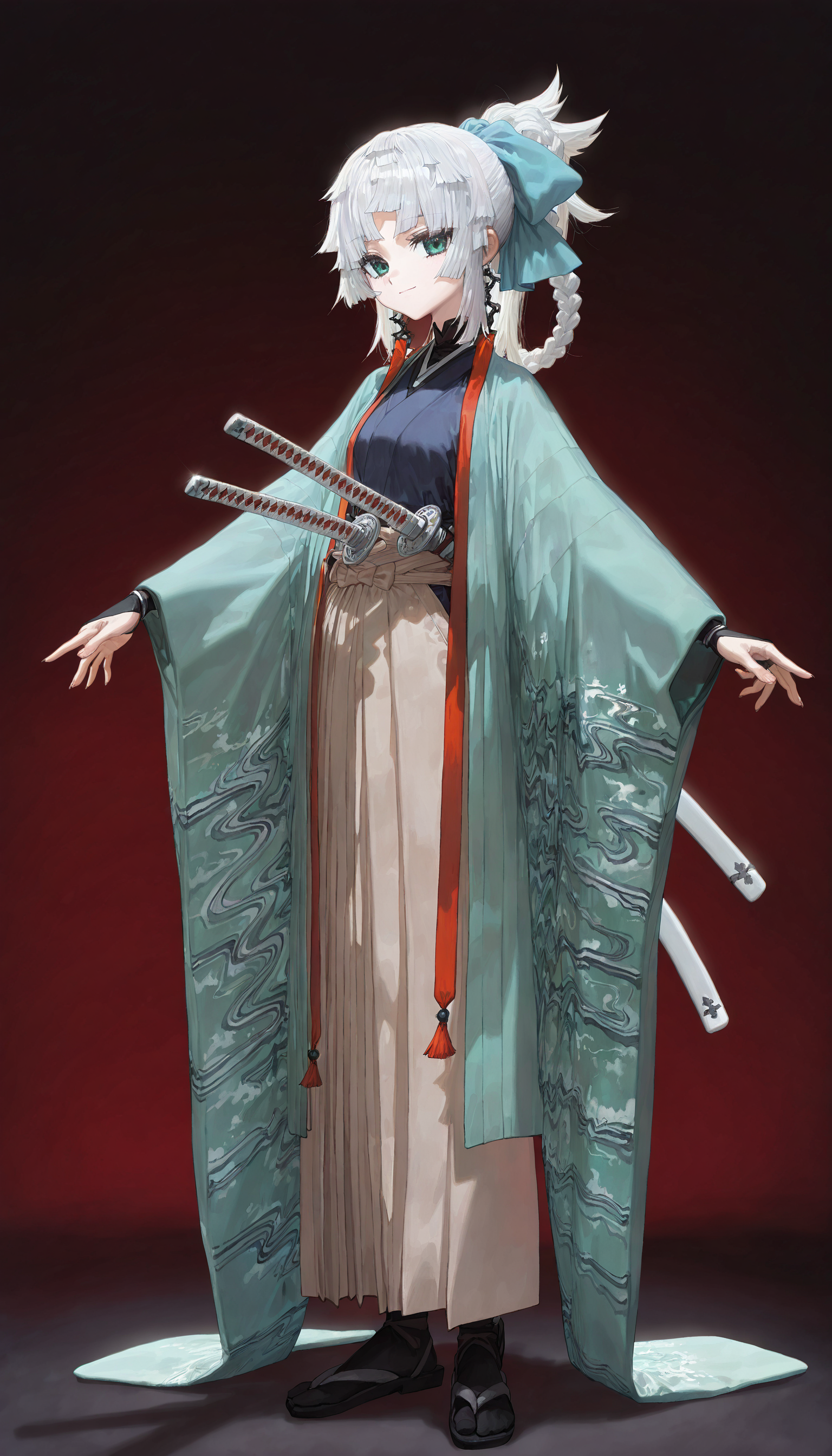 緑の目、白髪、ポニーテール、編み込み髪輪、髪リボン、