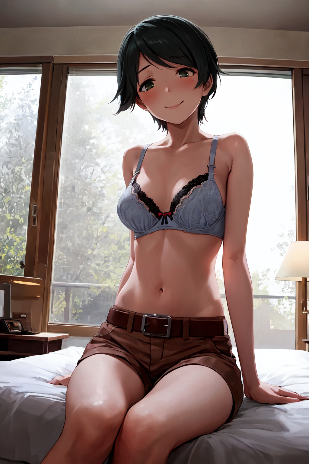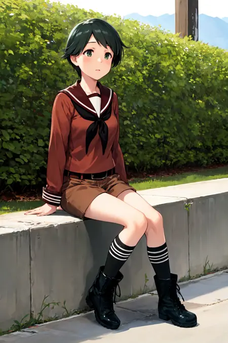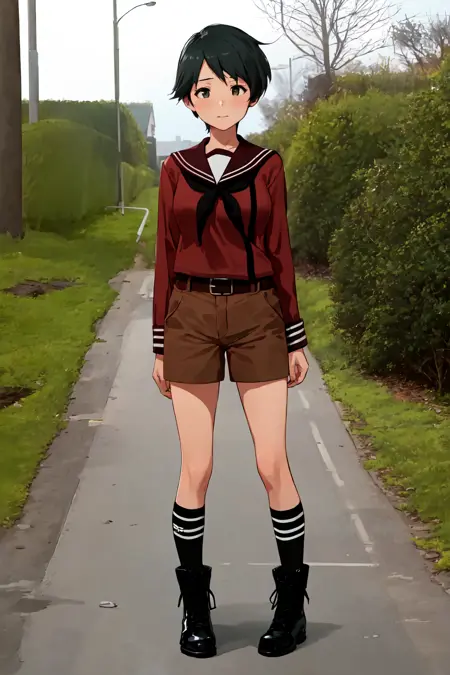 服装:校服,serafuku,棕色上衣,黑色领巾,腰带,棕色短裤,过膝袜,黑袜,黑色鞋履,靴子,