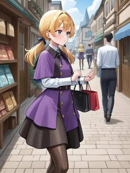프롬프트 예시: SO2weruti, 금발, 낮은 트윈테일, 머리 리본, 보라색 드레스, 흰색 셔츠, 긴 소매, 검은 치마, 검은 팔다리 웨어, 캐플레트,