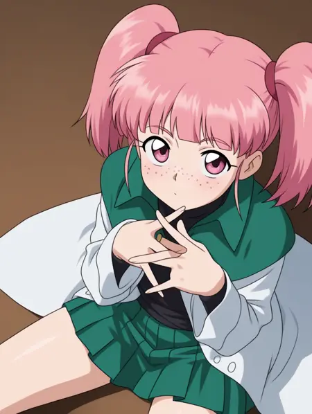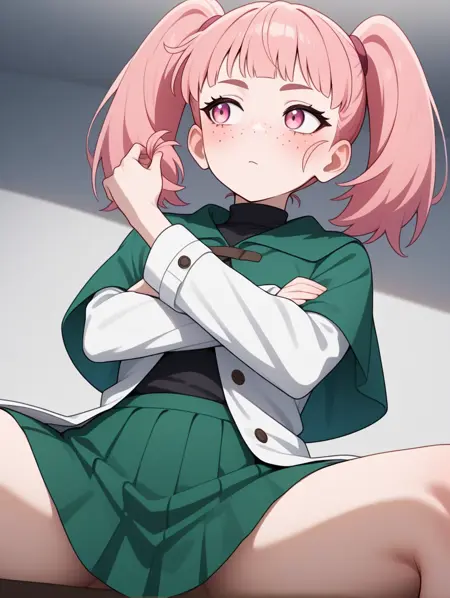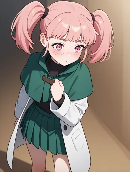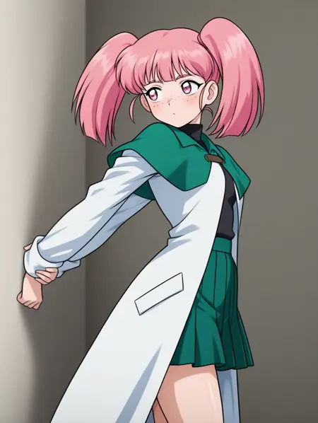 プロンプト例: yuki,ピンクの髪,ツインテール,そばかす,ピンクの目,タートルネック,白いロングコート,緑のプリーツスカート,緑のカペレット,黒いシャツ,アニメ調カラー,