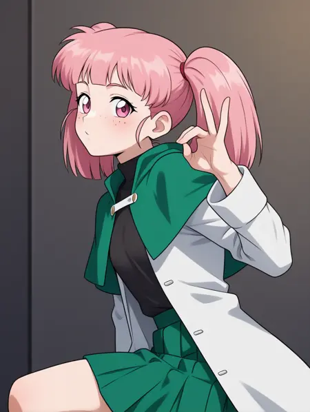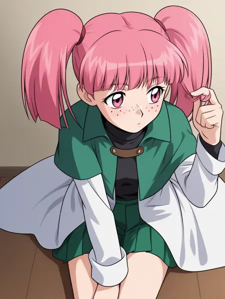 프롬프트 예시: yuki,pink hair,twintails,freckles,pink eyes,turtleneck,white long coat,green pleated skirt,green capelet,black shirt,anime coloring,