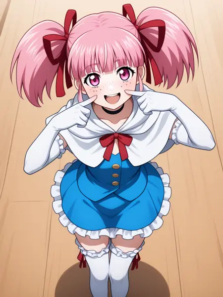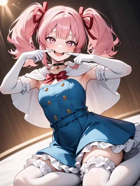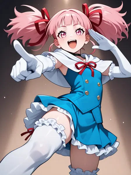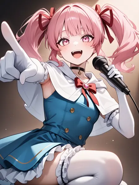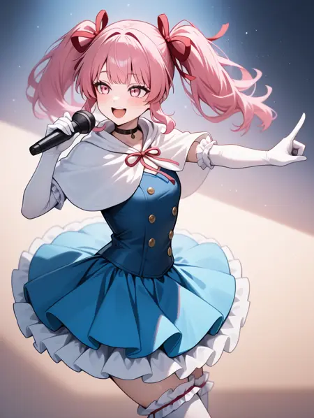 프롬프트 예시: aidoru,pink hair,twintails,hair red ribbon,pink eyes,choker,blue dress,frilled skirt,collarbonea,frilled thighhighs,frilled elbow gloves,freckles,light blue skirt,singing,white capelet,smile,buttons,2000s \(style\),