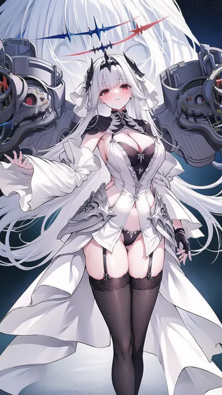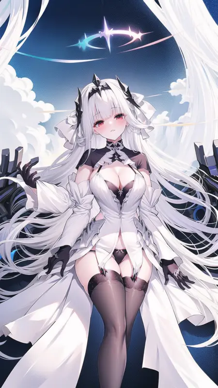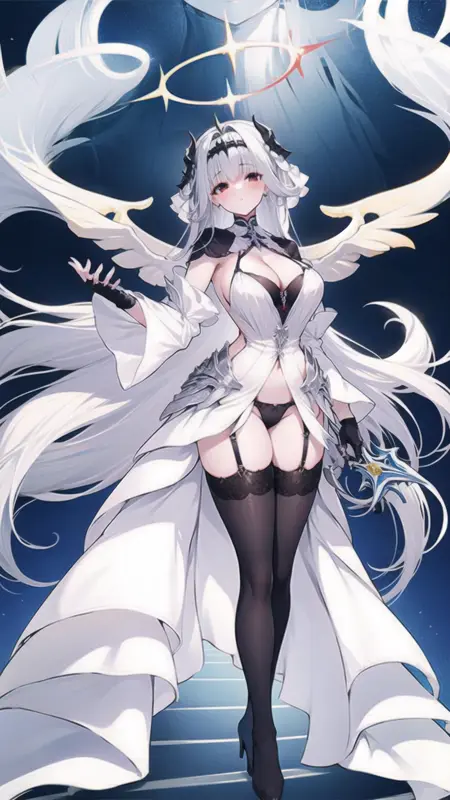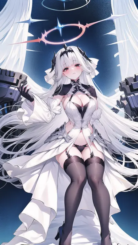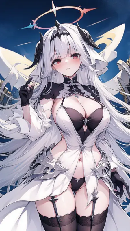 --> 프롬프트: marseillais, breasts, gloves, halo, fingerless gloves, black thighhighs, red eyes, white dress, black panties, underwear, panties, wide sleeves, garter straps, horns,