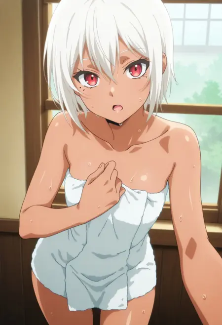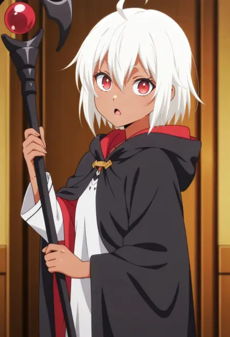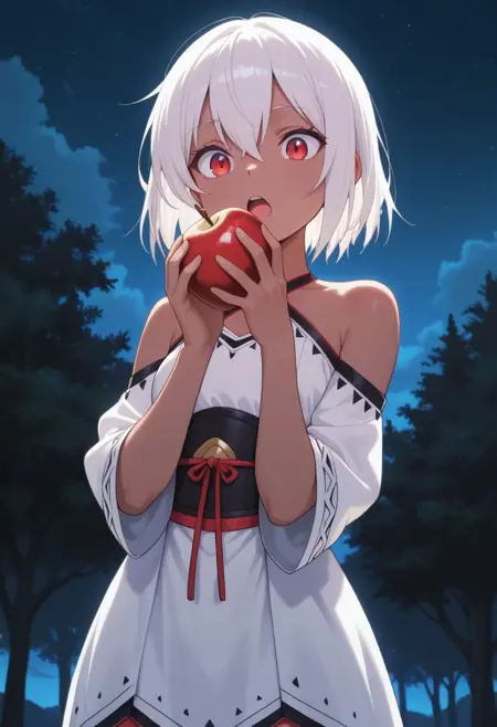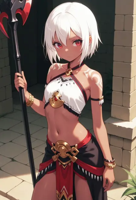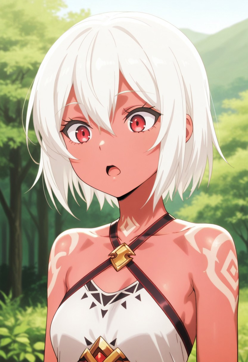 Trigger Words: myne, white hair, dark skin, dark-skinned female, short hair, red eyes