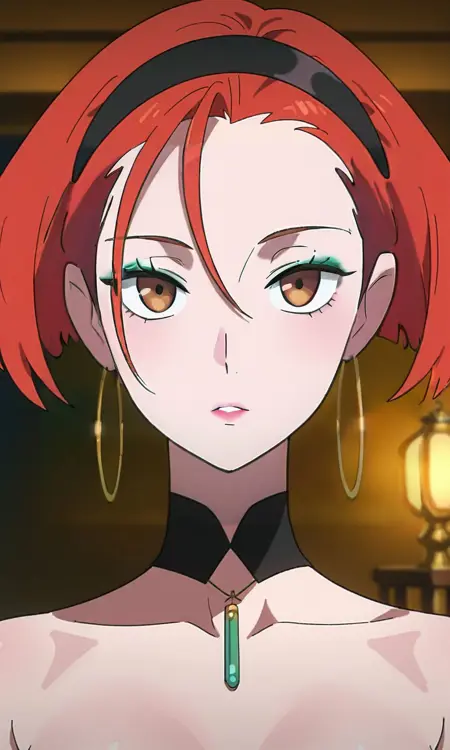 annqi, short hair, jewelry, brown eyes, red hair, hairband, hoop earrings