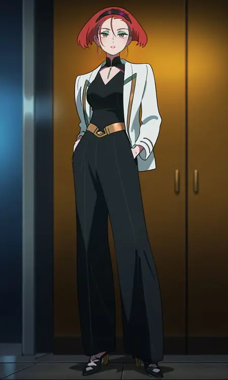 white jacket, black inner shirt, black pants, long wide pants, high heels sleeveless,
