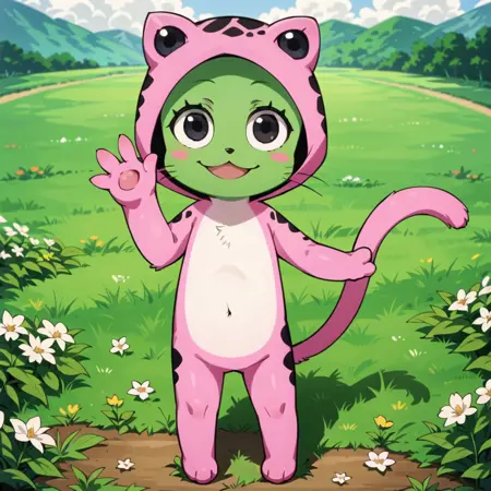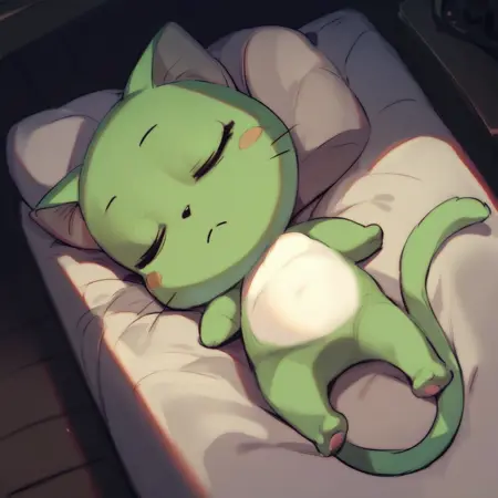 Cat, semi-anthro, green fur, black eyes, black nose, long tail, white belly,