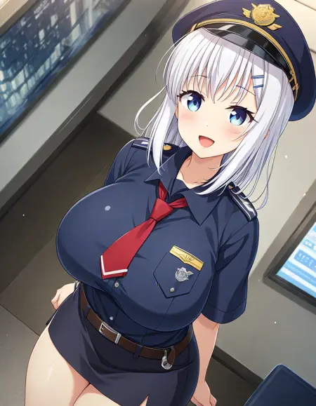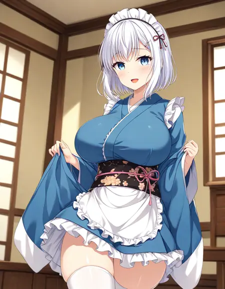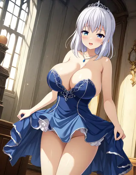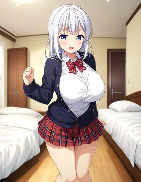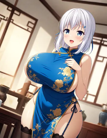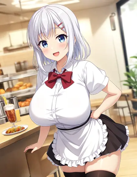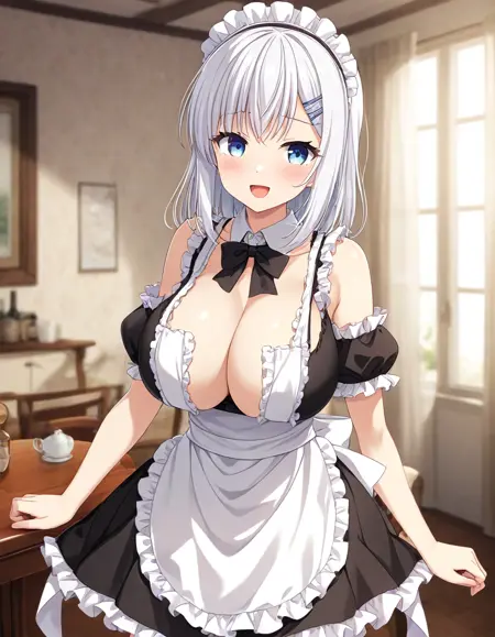 Recommend prompt:Mashiro Tsukino, beautiful woman, large breasts, inverted nipples, blue eyes, white hair, short hair, hairclips,