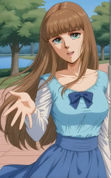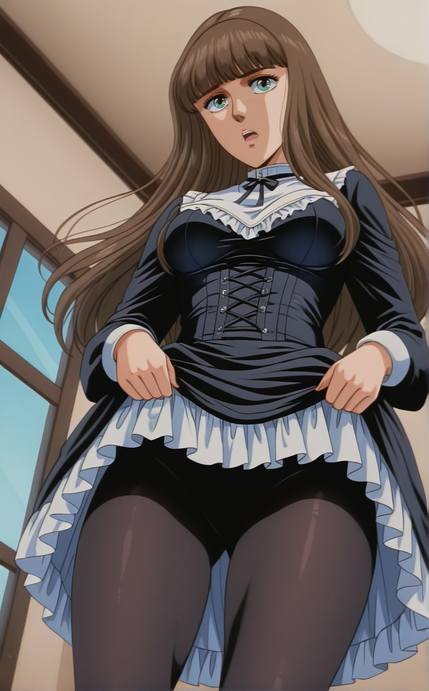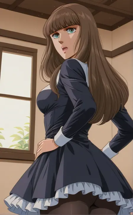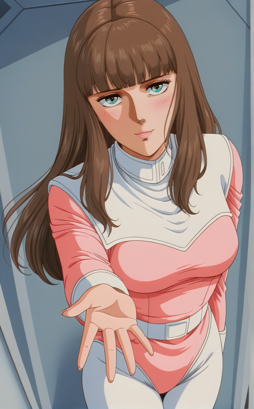 1girl,advart1najoanne,retro artstyle,1980s (style),solo,long hair,green_eyes,aqua_eyes,blunt bangs,medium breasts,brown hair,uniform,pink uniform,bodysuit,looking at viewer,best quality,masterpiece,sensitive , lora:AdvanceTinaJoannneNoobAI:1