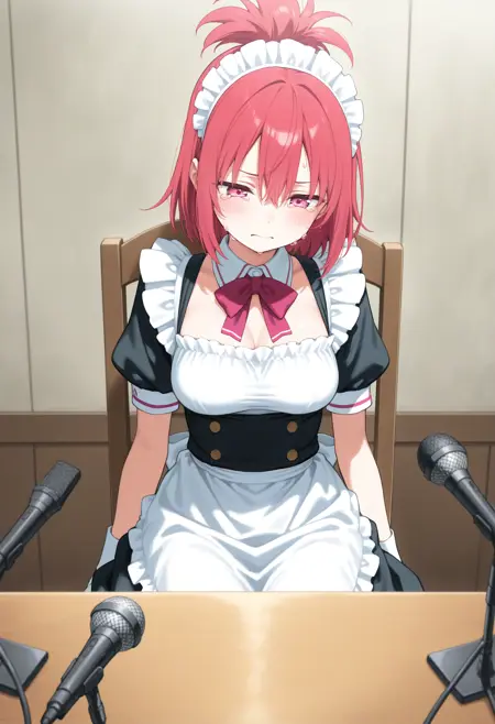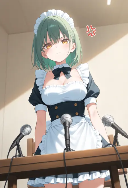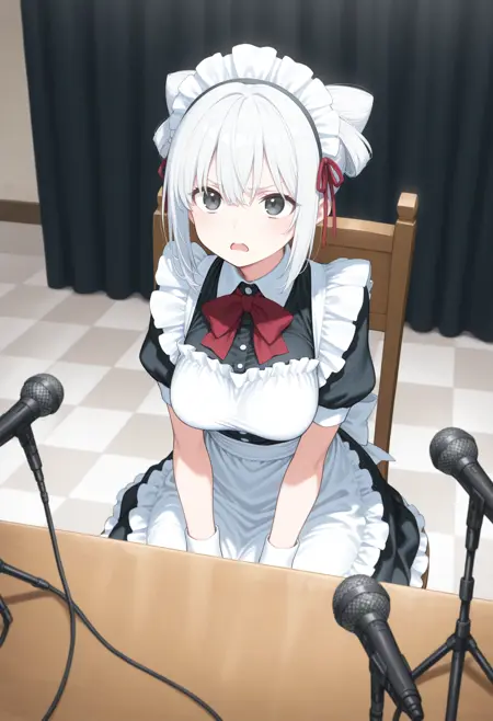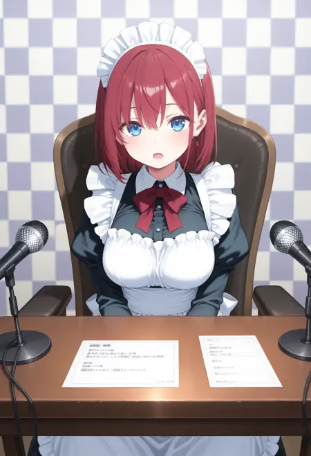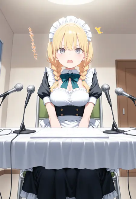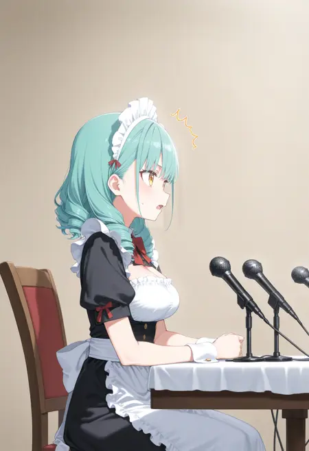 트리거만으로도 어느 정도 결과를 얻을 수 있지만, microphone, table, microphone stand, chair, indoors, cable, simple background, sitting 등을 추가하면 프레스 컨퍼런스 분위기가 더 강해집니다.