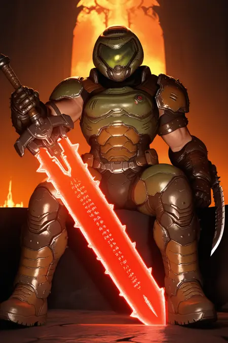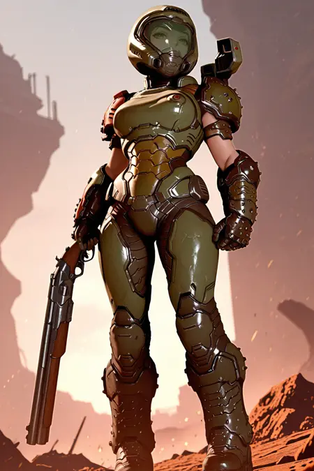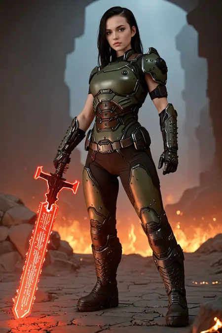 ドゥームスレイヤーとドゥームガール(通称クラッシュ)。偉大なAIで男性バージョンから女性バージョンを作るのは簡単だと思うけど、私は彼女の画像もトレーニングしたよ。クラッシュはかつてドゥームの軍事教官で、クェイクIIIアリーナでもプレイ可能だ。装備を増やすほど、衣装の再現度が高くなる(ショットガンを構える、光る剣を構える、ショルダーキャノン、アームブレードなど)。でも、少しごちゃごちゃになることも;)。