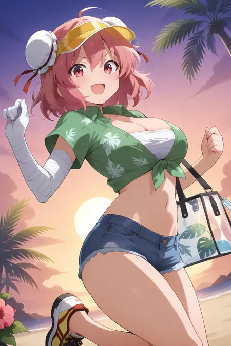 alternate costume, alternate hairstyle, bag, bandaged arm, bandaged chest, breasts, bun cover, cleavage, floral print, flower, frown, green shirt, hat, hibiscus, hibiscus print, leaf print, monstera deliciosa, navel, palm leaf, pink rose, shirt, shoes, short sleeves, short shorts, denim, thick thighs, tied shirt, transparent bag, visor cap, yellow visor,