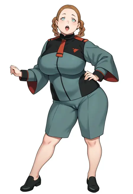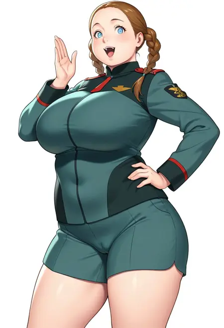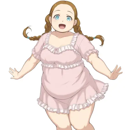 1girl solo, lilique, blue_eyes, brown hair, braided pigtails, chubby, plump,