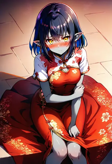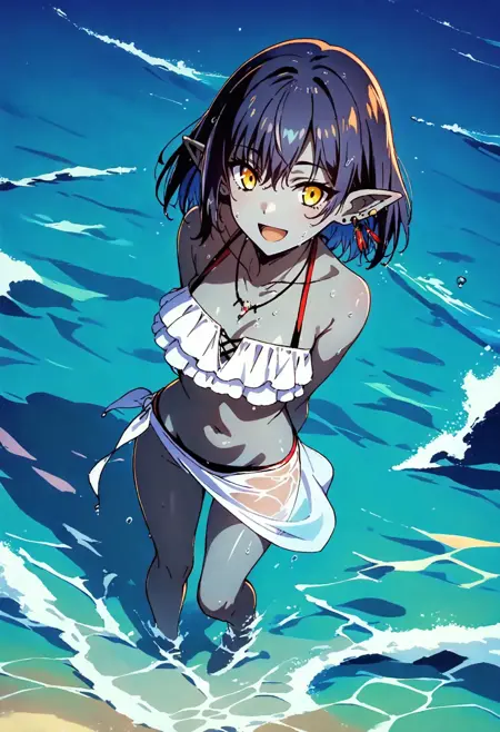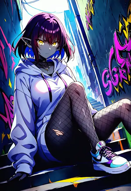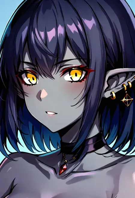 zadrisdm、尖った耳、ジュエリー、イヤリング、黄色い目、灰色の肌、短い髪、濃い紫の髪、