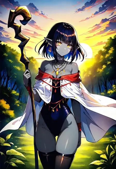 シンクホッグ、杖を持ち、ジュエリー、顔のマーク、イヤリング、片肩出し、ネックレス、レオタード、白いマント、チョーカー、