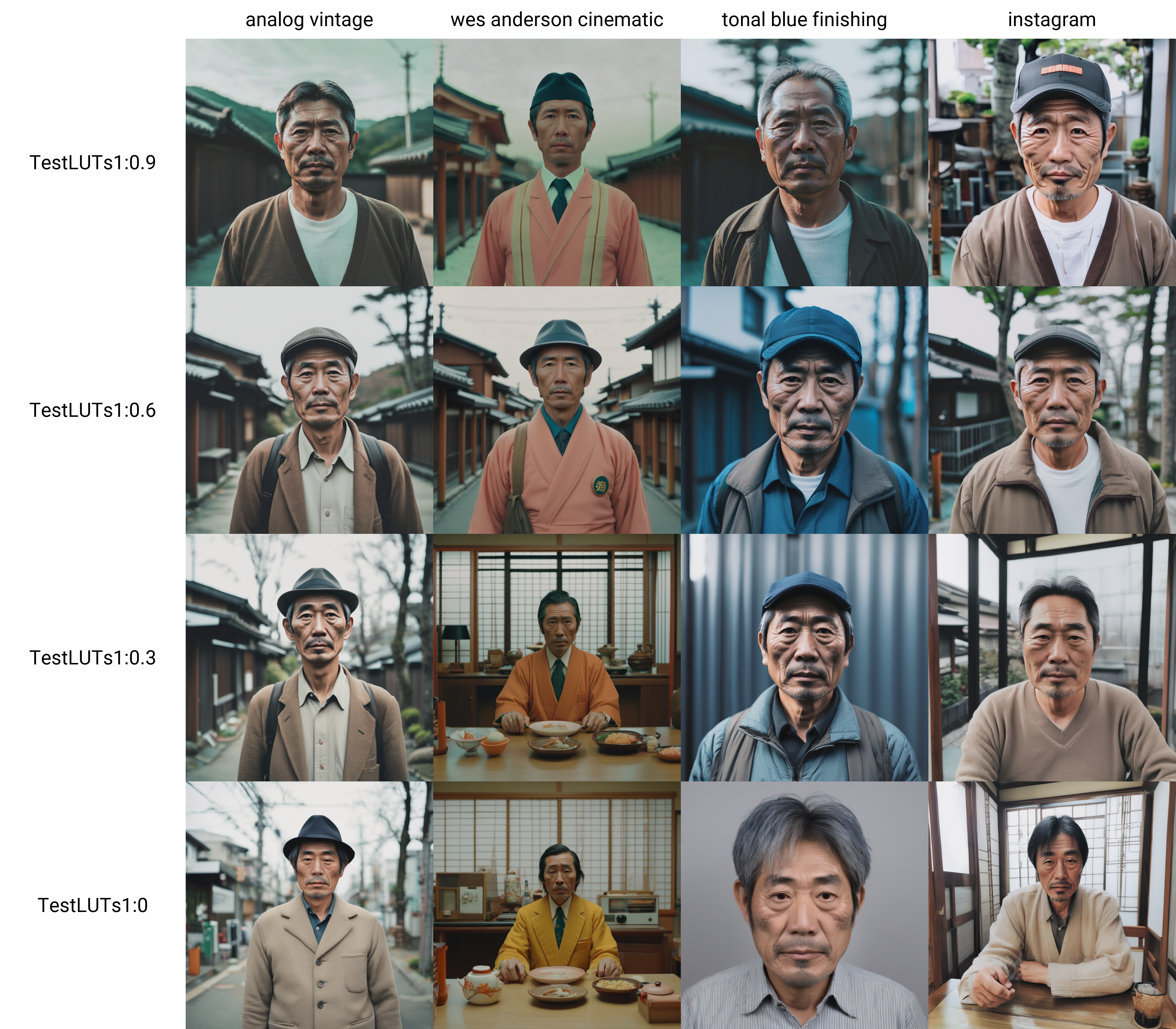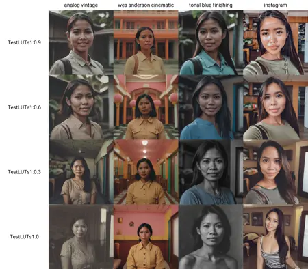 약 800개의 LUT을 기반으로 LoRA를 학습시켰으며, 이 중에는 영화 관련 LUT, 마무리 LUT, 웨딩, 아날로그, 시네마틱, 드라마, 빈티지 등이 포함되어 있습니다.