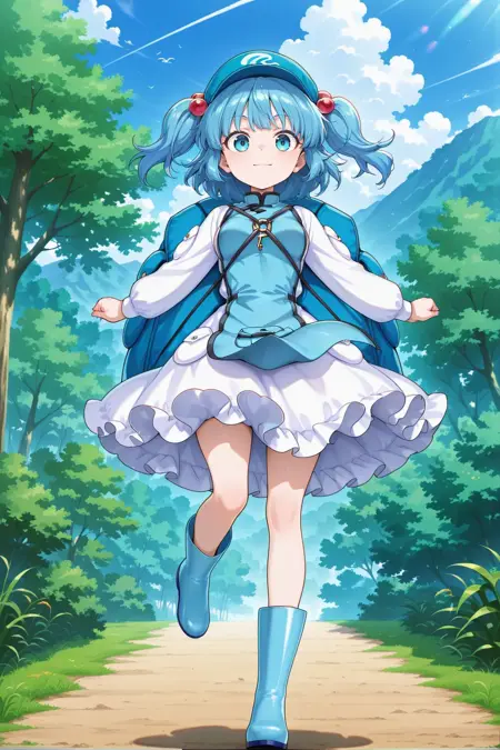kawashiro nitori, 1girl, solo, blue eyes, blue hair, short hair, two side up, kawashiro nitori \(pseudo-shikigami myoudouki giken\), alternate costume, blue hat, flat cap, hair bobbles, red bobbles, key, blue tabard, white dress, frilled dress, long sleeves, blue boots, rubber boots, blue backpack,