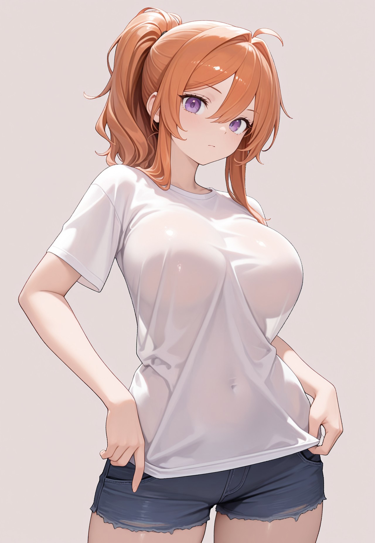 Zenith-WG、大きな胸、紫色の目、オレンジ色の髪、ポニーテール、目の間に髪、ブルー_クリアビーサー、首にホイッスル、ホワイト_ワンピース水着、露出度の高い服、サイドレス_アウター、ホワイトジャケット、オフショルダー、ホワイトサンダル、