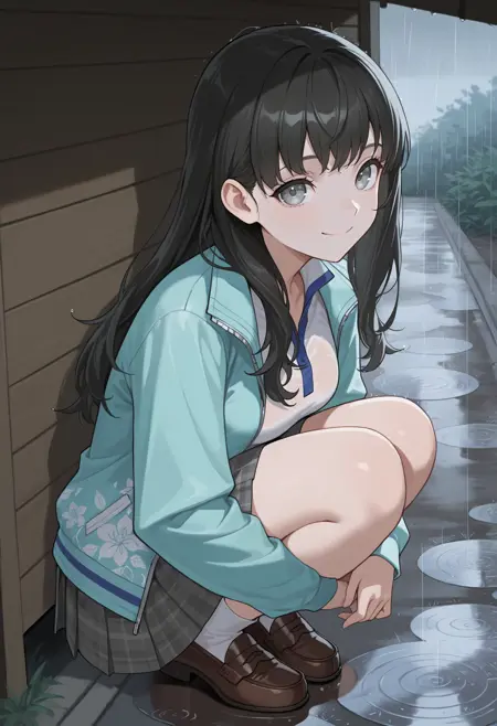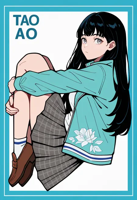 기본 외모: tao, 검은 머리, 긴 머리, 불규칙한 앞머리, 회색 눈, 아쿠아색 재킷, 열린 재킷, 트랙 재킷, 긴 소매, 플로럴 프린트, 흰색 셔츠, 칼라 셔츠, 회색 스커트, 체크 무늬 스커트, 주름 스커트