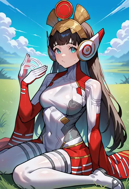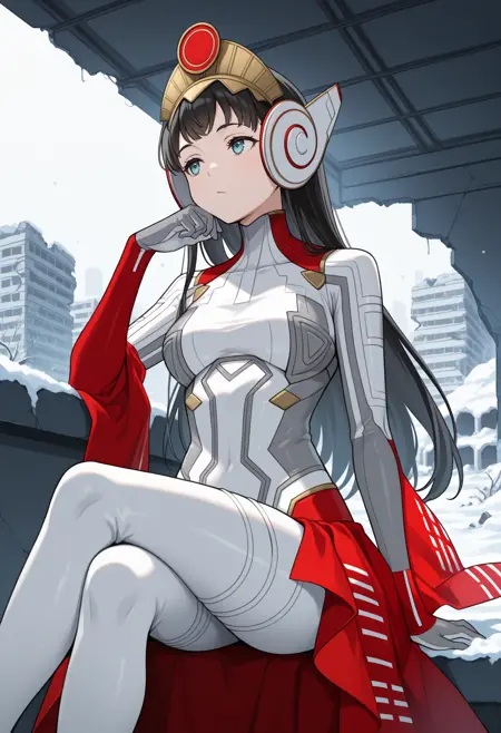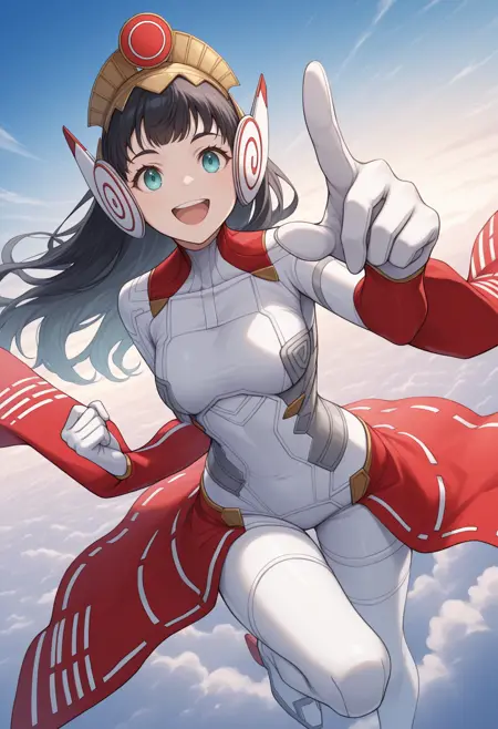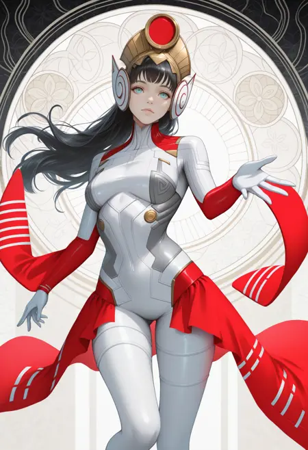 파나기아 외모: panag, 검은 머리, 긴 머리, 두건, 불규칙한 앞머리, 아쿠아색 눈, 흰색 바디슈트, 메카パイ롯 슈트, 분리된 소매, 빨간 소매, 후리소데 소매, 흰색 장갑, 빨간 스커트, 쇼걸 스커트