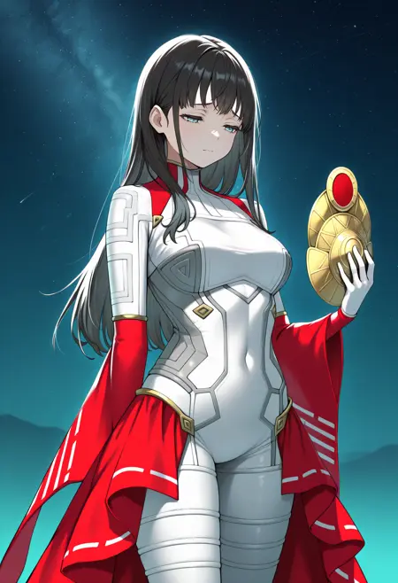 Panagia 外观: panag,黑发,长发,头饰,参差齐刘海,水蓝色眼睛,白色连体衣,机甲飞行员服,可拆卸袖子,红色袖子,振袖,白色手套,红色裙子,秀场裙