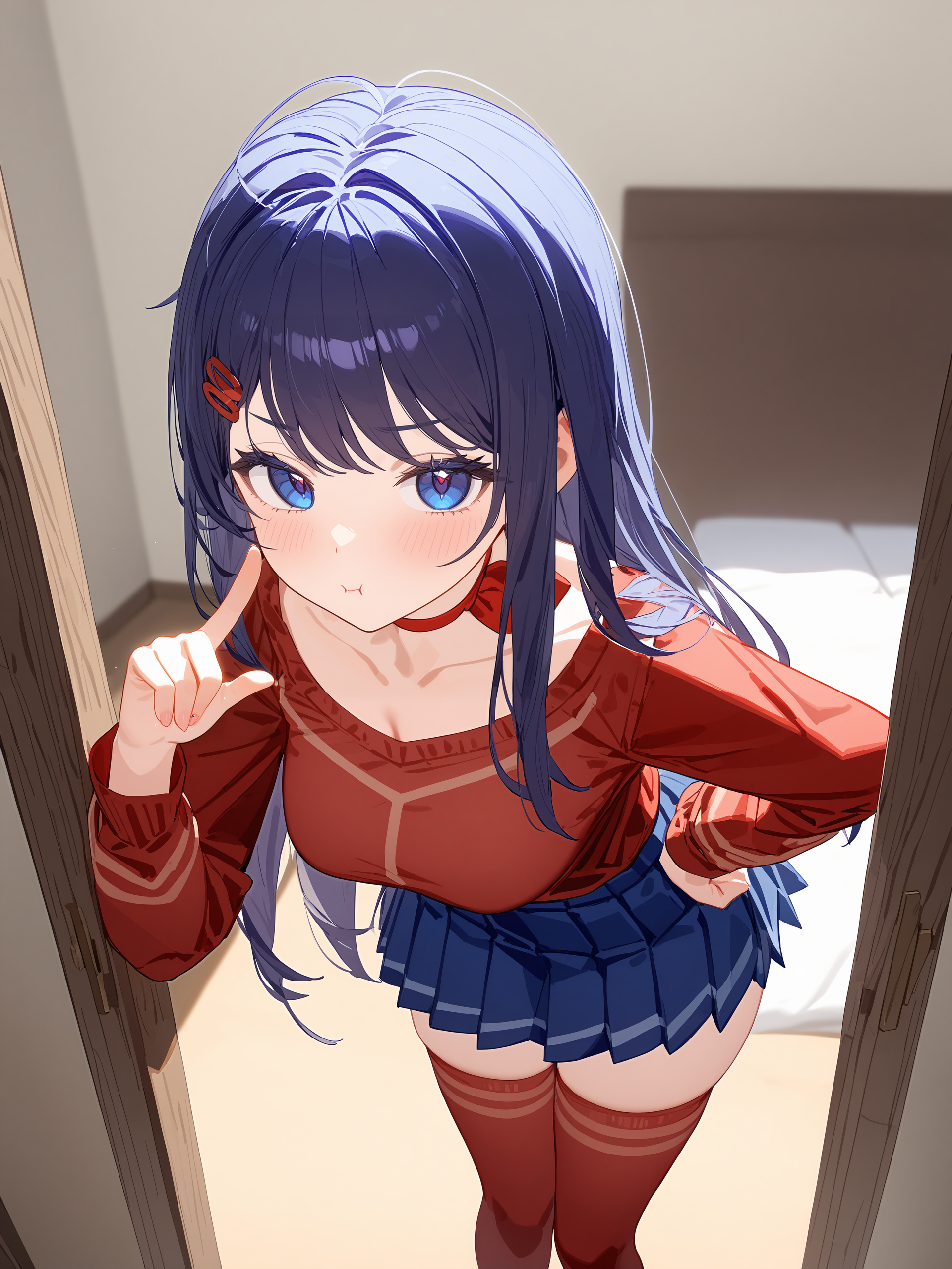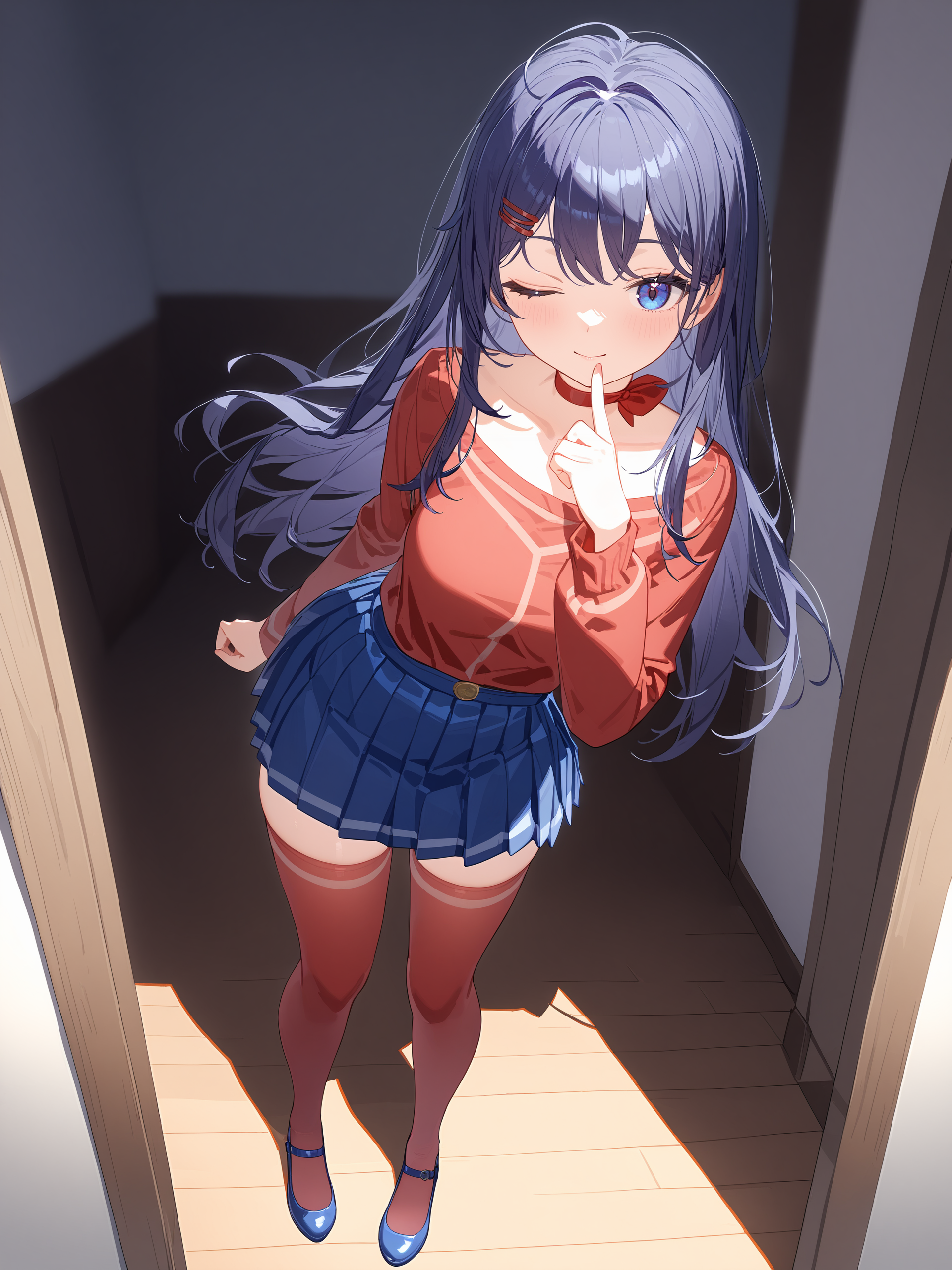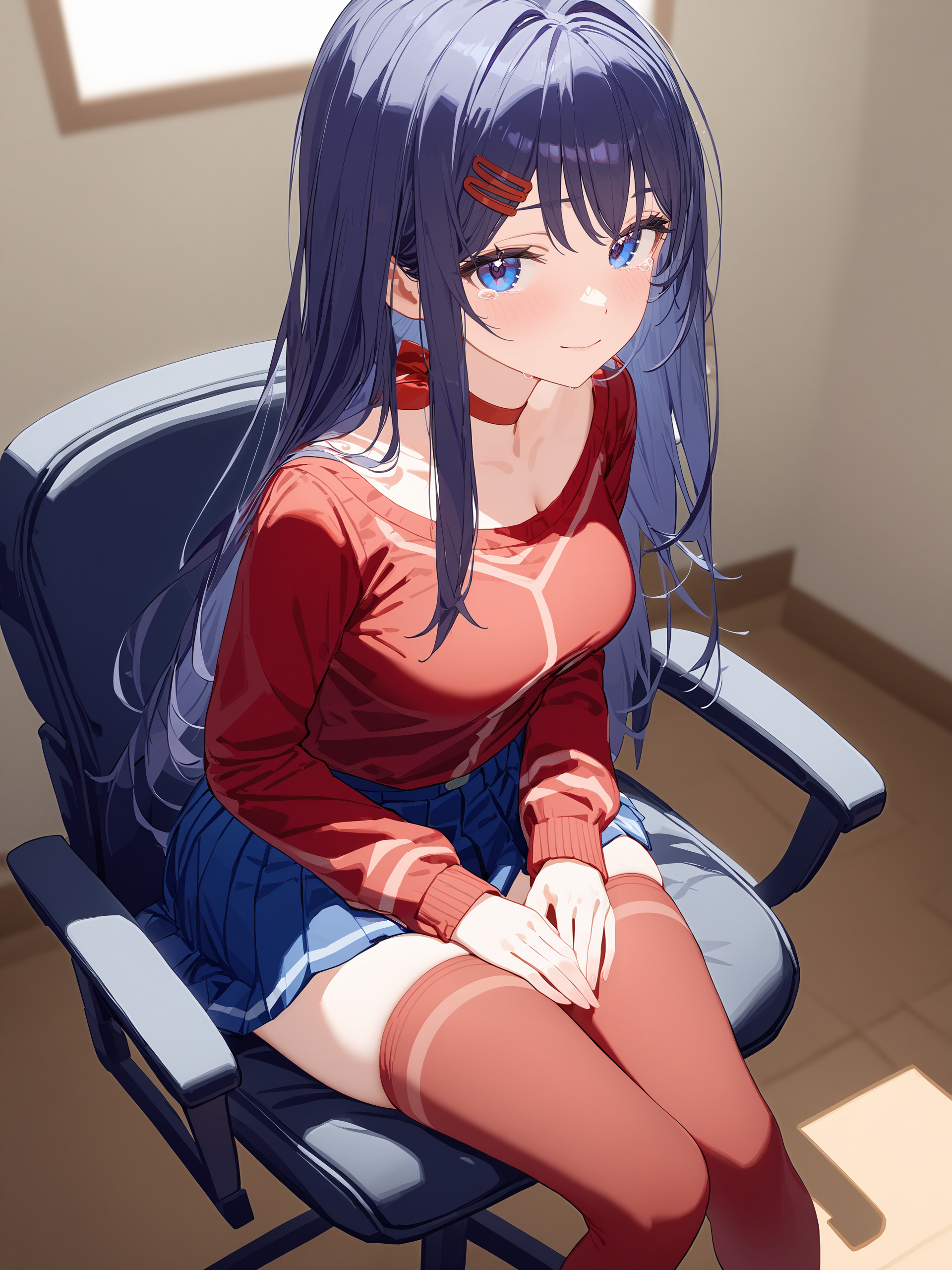 優しい Mita: 長い髪、ヘアリップ、赤いシャツ、赤いリボンのチョーカー、青いプリーツスカート、赤いレッグハイ、青いメアリージェーンズ
