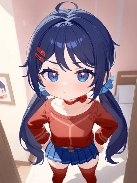 チビ Mita: チビ、単独、低いツインテール、ヘアクリップ、ヘアスクランチ、赤いシャツ、赤いリボンのチョーカー、青いプリーツスカート、赤いレッグハイ、青いメアリージェーンズ