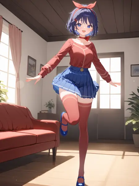 短髪 Mita: 短い髪、リボンヘアバンド、赤いシャツ、赤いリボンのチョーカー、青いプリーツスカート、赤いレッグハイ、青いメアリージェーンズ