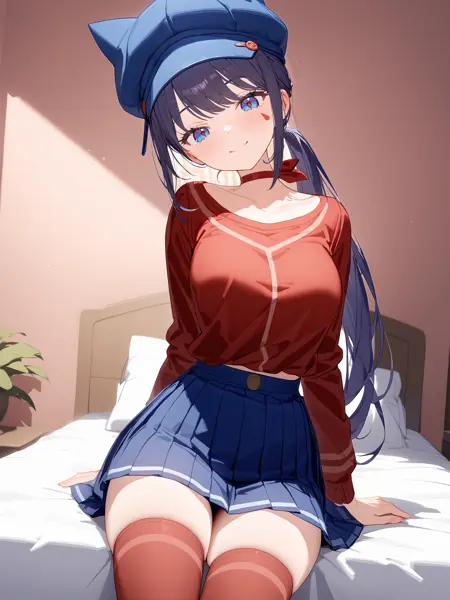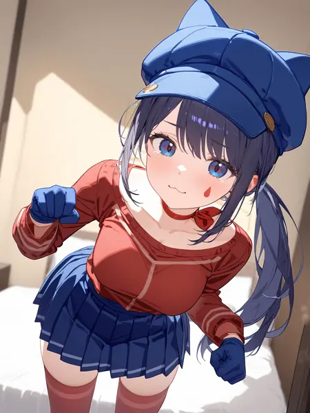 クール Mita (Cappie): mita \(miside\)、単独、涙型の顔のマーク、ポニーテール、猫の帽子、赤いシャツ、赤いリボンのチョーカー、青い手袋、青いプリーツスカート、赤いレッグハイ、青いメアリージェーンズ