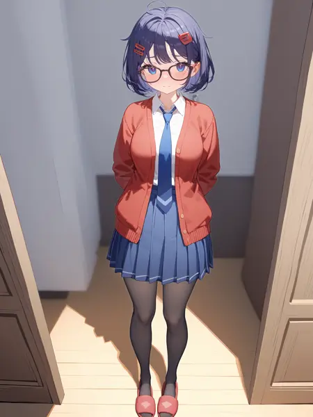 Mila: めがね、ボブカット、クラウヘアクリップ、青いネクタイ、白いシャツ、赤いカーディガン、青いプリーツスカート、黒いパンスト、赤いスリッパー