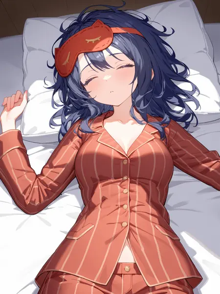 眠たい Mita: 縞模様のパジャマ、頭にマスク、足首リボン、縞模様のショートパンツ、乱れた髪、睡眠マスク