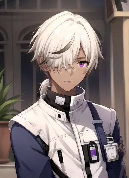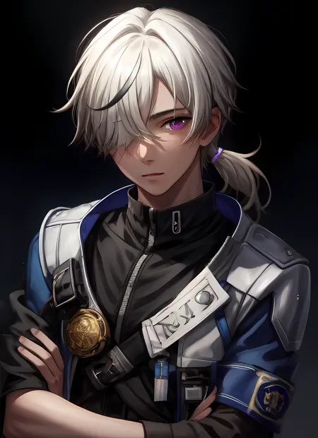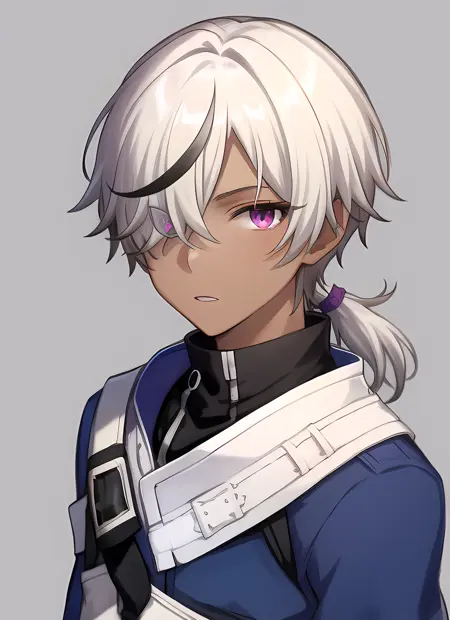 トリガー + 外見: Arlan, 短い低めのポニーテール、ストライプ模様の髪、片方の目に髪がかかる、濃い肌