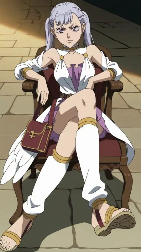 magic knight outfit, undershirt, purple undershirt, skirt, belt, bag, clothing cutout, dress, white dress, sandals, leg warmers,