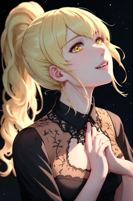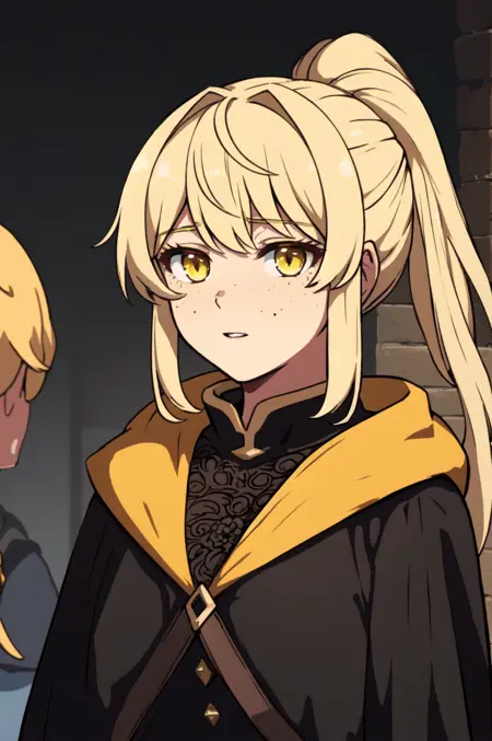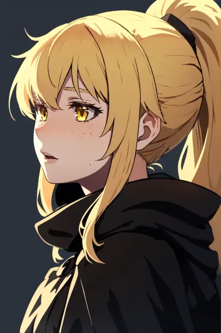 より良い外観にするには、「そばかす、黄色い目、ポニーテール」を追加してください。