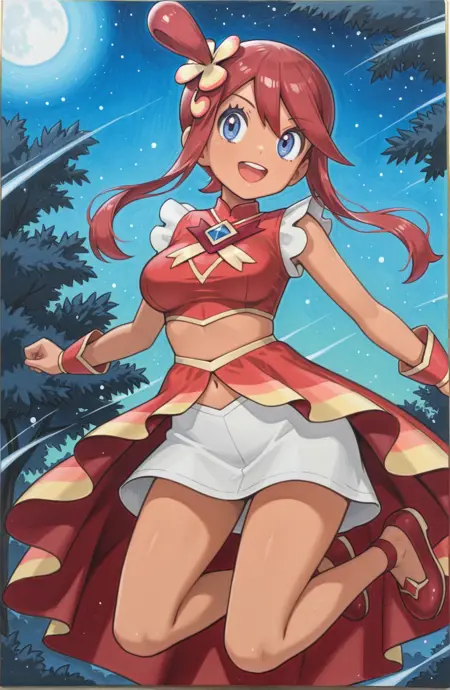 머리 장식, 소매 없는 셔츠, 빨간 셔츠, 치마, 복부, 손목 밴드, 평발 신발, 빨간 신발, 빨간 쇼걸 치마, 흰 미니 치마