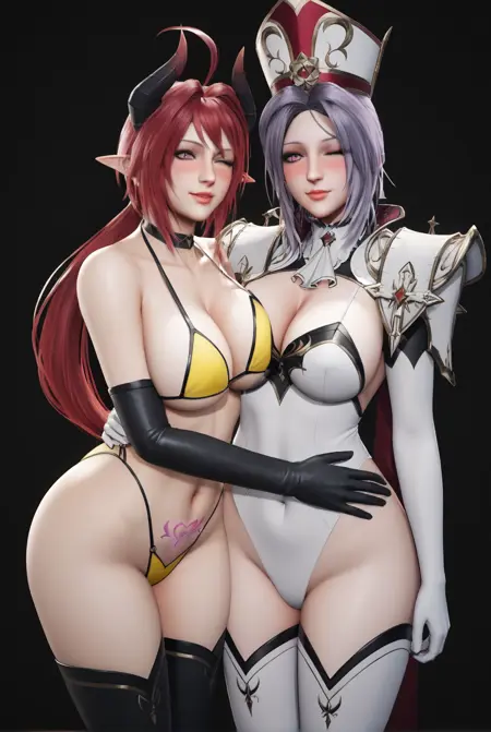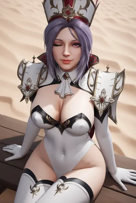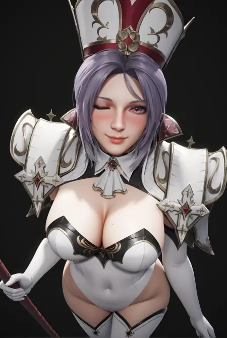 | 训练词汇 | High priestess, medium hair, pink eyes, grey hair, purple hair, ponytail, large breasts, mitre, cleavage, elbow gloves, white gloves, white thighhighs, white headwear, shoulder armor, strapless leotard, highleg leotard, pauldrons, white leotard, shrug (clothing), white thighhighs, white askot, high heels已复制! |