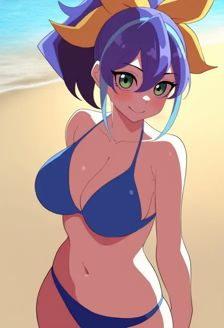 基本プロンプト:1girl, celina, blue hair, ponytail, multicolored hair, hair bow, two-tone hair, green eyes