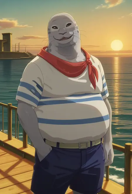 Sagwan, 1boy, mature male, anthro, spotted seal, light gray body, fat, big belly, dark gray sclera, black eyes, beastars