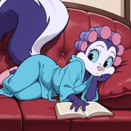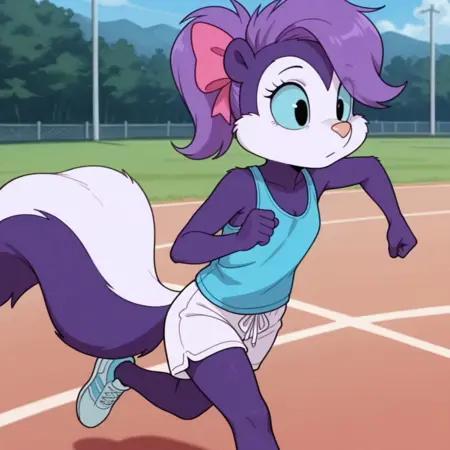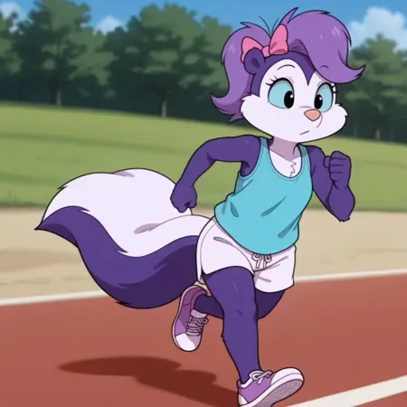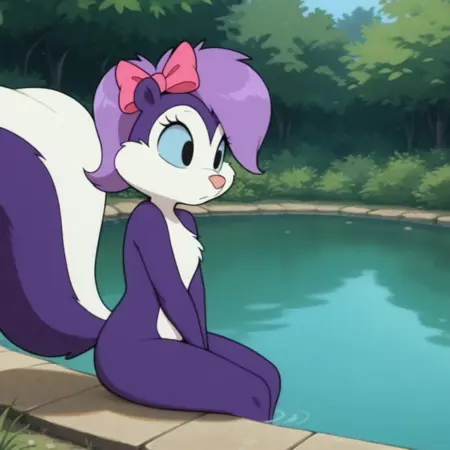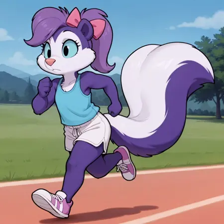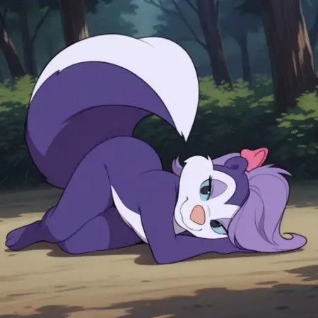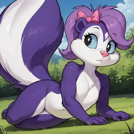 fifittail, anthro, female, skunk, purple fur, purple hair, black eyes, blue sclera