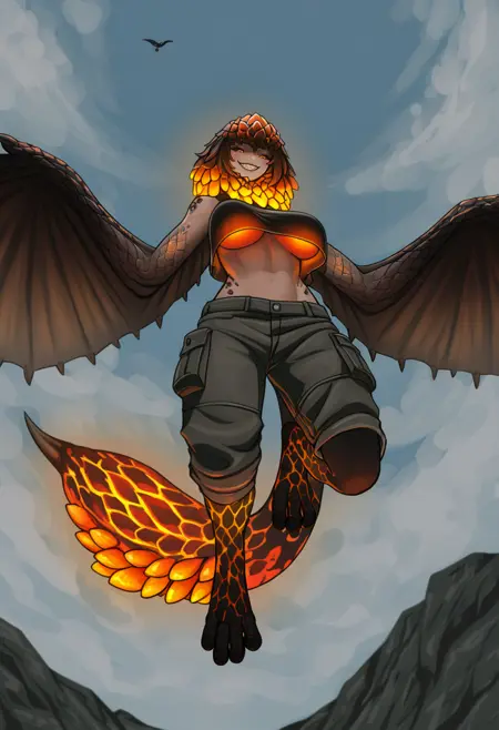 推荐正面词:bazelgeuse,翅膀,带翼的手臂,尾巴,橙色点缀*,发光点缀*,发光胸部*