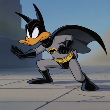 pluckyttail, semi-anthro, male, duck, batduck, black cowl, blank eyes, grey costume, black cape, black gloves, yellow belt, black boots, black speedo, grey tights