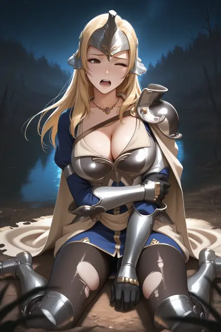 Add "helmet, necklace, single pauldron, blue dress, armored dress, beige cape, cleavage, short dress, gauntlets, black gloves, black pantyhose, armored boots" for her typical look.