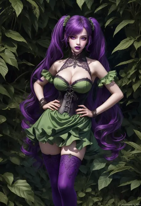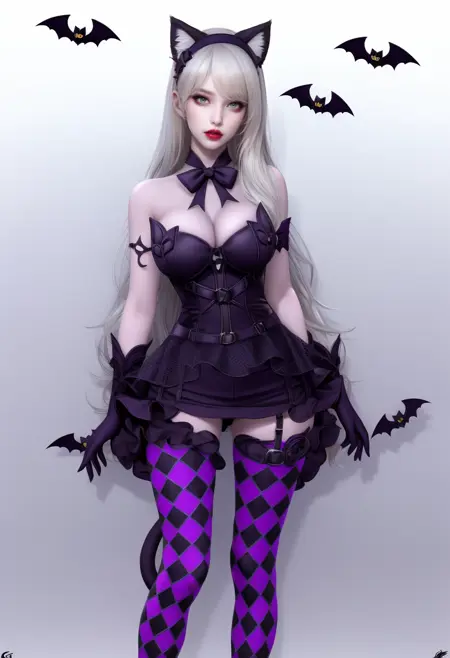 aionkitter最佳还原提示词: 束腰胸衣、荷叶边短裙、菱形花纹裤袜、菱形图案、菱形图案过膝袜、猫尾配饰、手套、高跟鞋、不对称设计、荷叶边、无袖连衣裙(若需更多服装变化,可不使用此词)。